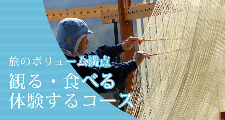 オリーブと同じく小豆島の特産品として有名なそうめん。美味しいそうめんが食べられる名店「なかぶ庵」では、食べるだけでなくそうめん作りが体験出来ます。今回はBの試食コースを選択。